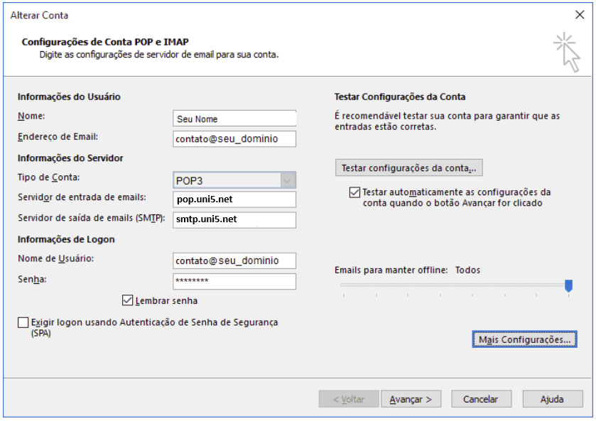 Abaixo vamos explicar como realizar as configurações de servidores de entrada e saída, mas neste mesmo caminho você saberá onde alterar suas senhas ou qualquer coisa que precise das suas configurações, pois o caminho é sempre o mesmo.